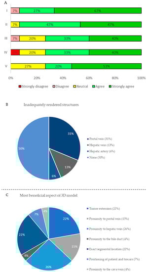 Chart results of the Questionnaire. (A) Stacked bar chart of Likert scale Questionnaire results displaying overall satisfaction with the 3D reconstructions used of the 15 patients in this feasibility study. (I) the 3D reconstruction helped me to accurately plan the operation when compared to 2D CT or MR imaging; (II) localization of tumors was more accurate using the 3D reconstruction compared to conventional 2D CT images; (III) the quality of the 3D reconstruction was high enough for clinical decision-making; (IV) I could well assess the proximity of tumors to important surrounding vital structures on the 3D reconstruction; (V) the performed surgical treatment was according to preoperative 3D planning. (B,C) Pie charts of the two multiple choice questions of the questionnaire displaying the most frequent inadequacies (B) and the most beneficial aspects (C) of the 3D reconstructions.