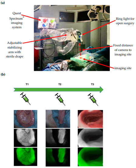 - Ris, F.; Liot, E.; Buchs, N.C.; Kraus, R.; Ismael, G.; Belfontali, V.; Douissard, J.; Cunningham, C.; Lindsey, I.; Guy, R.; et al. Multicentre phase II trial of near-infrared imaging in elective colorectal surgery. Br. J. Surg. 2018, 105, 1359–1367. [Google Scholar] [CrossRef]
