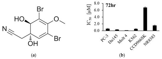 In previous studies, marine bromine-containing derivatives were found to possess numerous biological potentials, including the 2-(5-bromo-1H-indol-3-yl)-N,N-dimethylethanamine, and 2-(5-bromo-1H-indol-3-yl)-N,N-dimethyl-2-oxoacetamide showed significant antidepressant-like effects [31]. Pseudoceramines A–D and ceratinadins A-E demonstrated antimalarial and antibacterial activity [32,33]. Spermatinamine and aplysamine 6 inhibited isoprenylcysteine carboxyl methyltransferase (Icmt ) as an anticancer target, and fistularin-3 derivatives regulated DNA methyltransferase 1 (DNMT1) activity [34,35]. Aerothionin and subereaphenol C showed effective cytotoxic activity against human cervical cancer cells HeLa, and aeroplysinin-2 showed potent anti-migratory activity against the human breast cancer cell line MDA-MB-231 [36]. Aeroplysinin-1 (Apl-1) is a brominated isoxazoline alkaloid isolated from the marine sponge Pseudoceratina species (Figure 1a) [37,38]. Previous reports have indicated that this compound plays an important role in the chemical defense mechanism of sponges. In the biological assay, it showed antibacterial, antiviral, antiangiogenesis, antitumor, and anti-inflammatory effects [39]. Apl-1 inhibited cell growth and exhibited cytotoxic effects on a variety of tumor cells (cervical cancer, fibrosarcoma, colorectal cancer, and leukemia cancer), through the suppression and regulation of cell growth and survival-related proteins Akt and ERK [39]. It also induced γ-H2AX (a marker protein of DNA damage), activated caspase 3, and cleaved PARP (a marker protein of apoptosis) and p21 (cell cycle-related protein) [39,40,41]. Apl-1 inhibited the protein tyrosine kinase activity of the EGFR kinase complex of human breast cancer cells [41]. Apl-1 analogs inhibited EGFR tyrosine kinase activity, while Apl-1 did not show any significant inhibitory effect [42]. Nevertheless, Apl-1 potential as a cytotoxic agent is not extensively evaluated. Therefore, the purpose of this study is to evaluate the cytotoxic effect and anti-metastatic mechanism of action of Apl-1 on leukemia and prostate cancer cells. The effect of Apl-1 on the regulation of Nox/ROS was also examined.