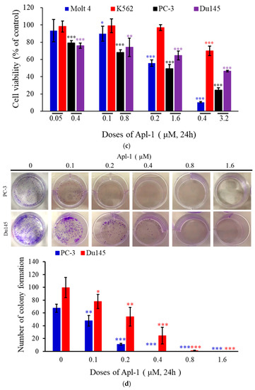 Previous studies on Apl-1 (Figure 1a) showed its potent cytotoxic activity against HeLa (cervical cancer cells), HCT-116 (colorectal cancer cells), NOMO-1 (acute myeloid leukemia), and HL-60 (promyelocytic leukemia cells) [40,46,47]. In this work, we used the MTT assay to evaluate the cytotoxic effect of Apl-1 on different cancer cells, including leukemia (Molt 4 and K562) and prostate cancer (PC-3 and Du145) cells, as well as on normal human skin cells (CCD966SK) and normal rat macrophage cells (NR8383). The results showed that Apl-1 exhibited potent cytotoxicity against leukemia cancer cells (Molt 4 and K562 cells with IC50 of 0.12 ± 0.002 and 0.54 ± 0.085 μM) and androgen-independent prostate cancer cells (PC-3 and Du145 cells with IC50 of 0.58 ± 0.109 and 0.33 ± 0.042 μM). For the normal rat macrophage cells NR8383 and normal human skin cells CCD966SK, Apl-1 resulted in IC50 of 1.54 ± 0.138 and 6.77 ± 0.190 μM, respectively, showing a weak cytotoxic activity (Figure 1b). The results indicated that Apl-1 selectively targeted cancer cells and exhibited weak cytotoxic activity against normal cells. Apl-1 showed a dose-dependent inhibitory effect on leukemia and prostate cancer cells. Apl-1 significantly inhibited the growth of the cells after 24 h at high concentrations (0.4 and 3.2 μM). The cellular inhibitory effects of Apl-1 on Molt4 and PC-3 cells were 89.6% and 75.7%, respectively (Figure 1c). The activity of Apl-1 in inhibiting prostate cancer and colony formation was tested in an in vitro cell survival test [48]. After treatment with Apl-1 (0.2 μM) for 6 h, the cells were cultured for 14 days, and the colony-formation effect of PC-3 cells was significantly reduced. In the case of Du145 cells, the colony formation was significantly reduced at a concentration of 0.4 μM (Figure 1d). Our results indicated that the cytotoxic effect of Apl-1 was cell-specific and dose-dependent.