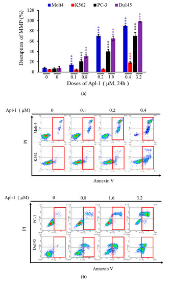 3.2. Apl-1 Induced Apoptosis and Interfered with Mitochondrial Membrane Potential in Leukemia and Prostate Cancer Cells