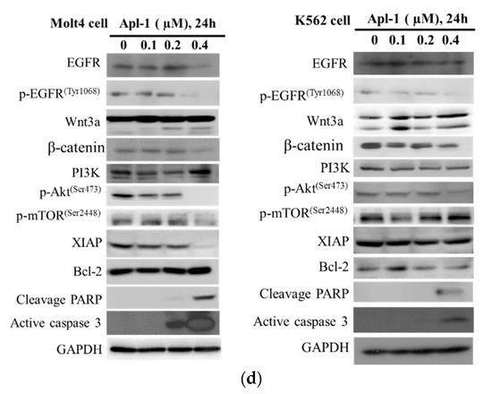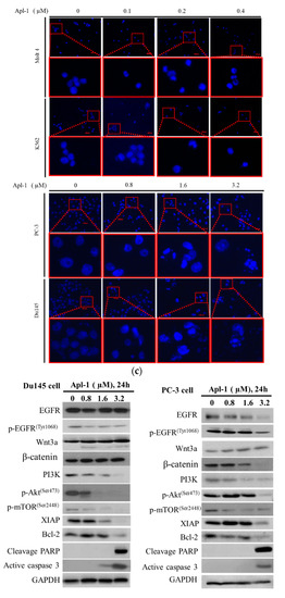 In previous studies, Apl-1 activated caspases −8 and −9 and induced mitochondria-mediated apoptosis in endothelial cells [55]. The intrinsic pathway of apoptosis is also called the mitochondrial pathway, which is mediated by the changes in the permeability of the outer mitochondrial membrane, impaired membrane potential, assembly, and activation of the pro-apoptotic protein Bax and anti-apoptotic protein B-Cell lymphoma 2 (Bcl-2) [56]. To evaluate the effect of Apl-1 on mitochondrial membrane potential, we used flow cytometry dye rhodamine 123 stainings. The results showed that after 24 h of Apl-1 treatment, leukemia and prostate cancer cells showed a dose-dependent increase in the disruption of mitochondrial membrane potential. Molt 4, K562, PC-3, and Du145 cancer cells treated with a high Apl-1 dose (0.4 or 3.2 μM) showed a significant increase in the mitochondrial membrane potential by 89.1%, 18.6%, 71.0%, and 98.1%, respectively (Figure 3a). Then we assessed whether Apl-1 induced apoptosis in leukemia and prostate cancer cells, using annexin V/PI double staining with flow cytometry. The treatment of the four cancer cell lines with Apl-1 showed a significant dose-dependent apoptotic-inducing effect. Among the tested cell lines, the highest proportion of apoptotic cells was shown in Molt 4 cells reaching 90.8% at 0.2 μM, while the proportion of apoptotic PC-3 and Du145 cells increased by 69.6% and 70%, respectively, after 24 h of treatment with 3.2 μM of Apl-1 (Figure 3b and Figure S2a). Nucleus fragmentation and chromatin condensation are typical features of apoptotic cells. The DAPI staining with a fluorescent microscope was used to evaluate the nuclear morphological changes. In Molt4, K562, PC-3, and Du145 cells, the number of condensed nuclei and nuclear fragments was higher in cells treated with high concentrations of Apl-1 (0.4 and 3.2 μM) than in the control showing intact and normal nuclei (Figure 3c). According to previous reports, Apl-1 regulates the EGFR and PI3K pathways that play an important role in cell proliferation, apoptosis, angiogenesis, and metastasis [39,57]. Western blot analysis showed that the treatment of K562 and Molt4 cells with Apl-1 (0.4 μM) significantly increased active caspase-3 and cleaved PARP protein expression. It also decreased the expression of anti-apoptotic proteins, including p-Akt (ser473) and XIAP (Figure 3d). In prostate cancer cells, Apl-1 treatment increased PARP cleavage and activated caspase-3 expression, and inhibited the expression of anti-apoptotic proteins p-Akt (ser473), p-mTOR (ser2448), XIAP, and Bcl-2 (Figure 3d and Figure S2b). The Apl-1 (high dose) was found to significantly reduce the expression of EGFR and p-EGFR(Tyr1068) protein in Molt4 and PC-3 cells, but produced no change in EGFR and p-EGFR(Tyr1068) protein in K562 and Du145 cells. The abnormal activation of the Wnt signaling pathway is closely related to tumor progression and involved in various types of cancer. The classical pathway is the Wnt/β-catenin pathway, in which Wnt3a and β-catenin play important roles in regulating cell proliferation, differentiation, and development [58]. However, the results of western blot showed that Apl-1 did not significantly alter the expression of Wnt3a in Molt4, K562, PC-3, and Du145 cells, but it decreased the expression of β-catenin protein. Based on the above results, it was found that Apl-1 could induce cancer cell apoptosis by regulating the activity of anti-apoptotic proteins and increasing the expression of pro-apoptotic proteins. The apoptotic effect might involve regulation of the PI3K/AKT/mTOR pathway.