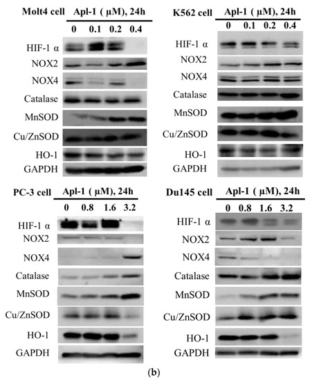 The generation of ROS is mainly derived from complexes I and III of the mitochondrial electron transport chain or from the nicotinamide adenine dinucleotide phosphate NADPH oxidase family on the membrane, which affects the membrane permeability, resulting in mitochondria-mediated apoptosis [59,60]. Previous studies observed that Apl-1 could inhibit the peroxidase NADPH oxidase and activate superoxide dismutase (SOD) to regulate the oxidative balance of endothelial cells, but it did not affect the catalase activity [61]. To understand whether Apl-1 affects the oxidative balance of leukemia and prostate cancer cells, flow cytometry dye dihydroethidium (DHE) was used to evaluate reactive oxygen species generation in cancer cells. Molt 4, K562, PC-3, and Du145 cells were treated with a high concentration of Apl-1 (0.4 or 1.6 μM), which increased the accumulation of intracellular ROS content 4.6-fold, 3.3-fold, 1.8-fold, and 1.3-fold, respectively (Figure 4a). Our results showed that Apl-1 increased the accumulation of ROS in leukemia and prostate cancer cells. Through protein analysis, we can better understand the activity of Apl-1 in regulating the oxidative balance in cancer cells. We found that Apl-1 significantly inhibited the expression of HIF-1 α protein in prostate cancer and leukemia cells (Figure 4b and Figure S3). Apl-1 treatment reduced the expression of the antioxidant protein HO-1, and increased the expression of catalase and MnSOD in Molt 4, PC-3, and Du145 cells. Apl-1 (3.2 µM) significantly increased the expression of oxidized protein NOX4 and down-regulated the expression of NOX2 protein in PC-3 cells. Apl-1 (0.4 or 1.6 μM) upregulated the expression of NOX2 protein and inhibited the expression of NOX4 protein in Molt 4 and Du145 cells. Although Apl-1 showed different regulation mechanisms in different cells, its activity on NOX-related proteins caused cancer cells to produce too much ROS, which was accompanied by a reduction in the related antioxidant proteins.