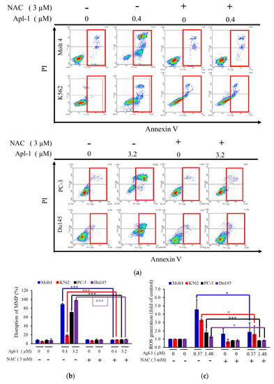 Apl-1 induced apoptosis and mitochondrial membrane potential disruption via Nox/ROS. (a) Leukemia and prostate cancer cells were pretreated with NAC for 30 min followed by Apl-1 for 24 h. The apoptotic population was examined with annexin-V/PI staining; the effect of the apoptotic induction with Apl-1 in cancer cells involved ROS production. The cells were treated with different doses of Apl-1 for 24 h. Leukemia and prostate cancer cells were pretreated with NAC for 30 min, followed by different doses of Apl-1 for 24 h. (b) The disruption of MMP and (c) ROS generation were examined with rhodamine 123 and DHE staining, respectively, using flow cytometry. (d) The effect of NAC pretreatment on the cytotoxic activity of Apl-1 was detected by Western blot assay. GAPDH acted as the load control. The results are presented as the mean ± SD of three independent experiments. (* p < 0.05; *** p < 0.001, control vs. Apl-1 group).