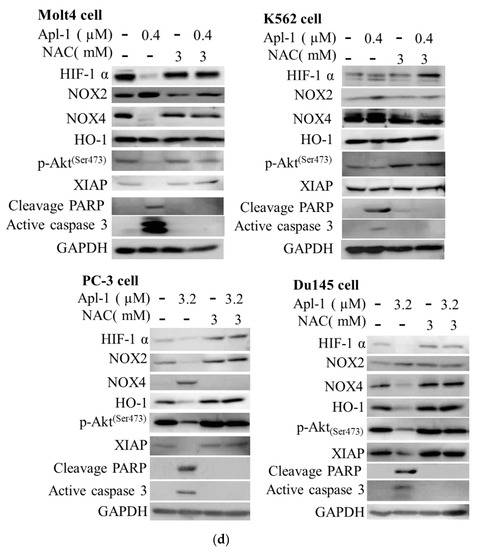 To confirm whether the apoptosis and mitochondrial membrane potential induced by Apl-1 are related to the accumulation of ROS in the cells, the ROS scavenger N-acetyl-l-cysteine (NAC) was used in the pretreatment of cells. As shown in Figure 5a and Figure S4, pretreatment with NAC significantly reduced apoptosis induced by Apl-1 by 80.7% (Molt 4), 22.1% (K562), 61.45% (PC-3), and 59.15% (Du145). The percentages of impaired mitochondrial membrane potential were, respectively, 89.1% to 8.3% and 18.6% to 8.6% in Molt 4 and K562 cells treated with Apl-1 0.4 μM after NAC pretreatment (Figure 5b). As shown in Figure 5c, pre-treatment with NAC reduced the accumulation of intracellular ROS caused by Apl-1. The above results showed that after 24 h of the pre-treatment of NAC, there was a recovery effect on both the damaged mitochondrial membrane potential and the proportion of apoptosis. The NAC pretreatment showed similar protein expression results to the negative control group. NAC pretreatment attenuated Apl-1-induced inhibition of HIF-1α and HO-1 (antioxidant-associated protein), XIAP (anti-apoptotic protein), and p-Akt expression (Figure 5d). It also reduced Apl-1-induced expression of pro-oxidative proteins, NOX2 or NOX4, and the pro-apoptotic protein cleavage of PARP and caspase-3 activation (Figure 5d). These results suggested that NAC inhibited Apl-1-induced ROS regulation of the related apoptotic pathways as well as the cellular oxidative dysregulation.