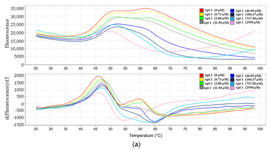 Protein thermal shift was detected according to the previous description and the manufacturer’s method using HSP90 recombinant protein (1 μg/μL/reaction) and different concentrations of Apl-1 as ligands [21]. The thermal shift buffer (5 μL) was added, 8X Sypro Orange fluorescent dye (2.5 μL) was added, and the final volume of 20 μL was attained with distilled H2O. Multidrop Combi Reagent Dispenser (Thermo Fisher Scientific, Waltham, MA, USA) was used to spot the tested compounds at different concentrations on MicroAmp Optical Adhesive Film (Applied Biosystems, Foster City, CA, USA). The reactants were sealed and mixed. A Multidrop Combi Reagent Dispenser (Thermo Fisher Scientific, Waltham, MA, USA) was used to detect different concentrations of Apl-1 samples on MicroAmp Optical Adhesive Film (Applied Biosystems, Foster City, CA, USA), and the reactants were sealed and mixed. The plate temperature was heated from 25 to 99 °C at a heating rate of 1 °C/min. The detection was undertaken in the Step One Plus Real-Time PCR instrument (Applied Biosystems, Foster City, CA, USA). Displacement software (version 1.3, Applied Biosystems, Foster City, CA, USA) was used to calculate the melting temperatures (Tm) and to establish the thermal curve. The determination of Apl-1 was carried out at different concentrations in triplicate.