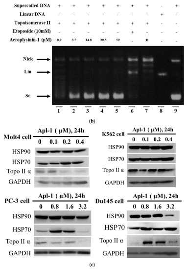 The effect of Apl-1 on the binding ability of Hsp90 and topo IIα protein. (a) Hsp-90 (1 μg) protein was used with different doses of Apl-1 to analyze the difference in melting temperature through fluorescence emission as a function of temperature (dF/dT). (b) Effects of Apl-1 on Topo II-mediated relaxation of supercoiled pHOT1 plasmid DNA in a cell-free system. Lane 6: Positive control, etoposide (10 mM), as Topo II poison (induction of linear DNA); Lane 7: Plasmid DNA + topo IIα + solvent control (induction of DNA relaxation); Lane 8: linear DNA; Lane 9: Negative control plasmid DNA (supercoiled DNA). Lanes 1–5: Apl-1 (0.9, 3.7, 14.8, 29.5, and 59 μM). Nick, nicked DNA; Sc, supercoiled DNA; Lin, linear DNA. (c) Apl-1 was used at different doses for 24 h, and the expression of Hsp90 and topo IIα related proteins was analyzed by Western blot.