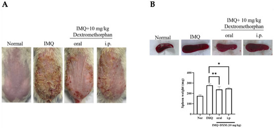 Oral DXM alleviates the clinical symptoms of IMQ-induced murine psoriasis. (A) The macroscopic appearance and the psoriasis area with 10 mg/kg treatment by oral and intraperitoneal injection. (B) The spleen weight of IMQ-induced psoriasis-like mice after DXM treatment. Significant differences from IMQ treated group are indicated by * p < 0.05, ** p < 0.01 (One-way ANOVA).