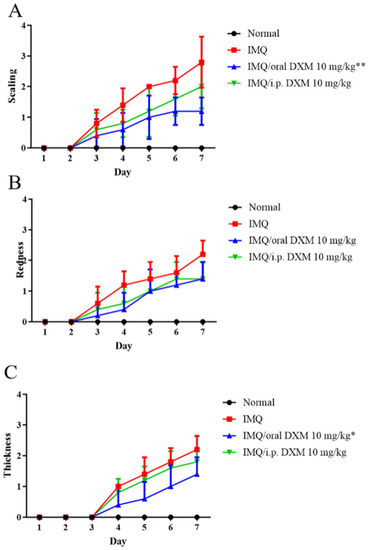 The subcomponents of psoriasis area and severity index (PASI) score, (A) Scaling, (B) Redness, and (C) Thickness, of the skin lesion were demonstrated in normal mice and IMQ-induced murine psoriasis (n = 5 in each group), after treatment with IMQ only (red), 10 mg/kg DXM by oral (blue) or intraperitoneal injection (green). * p < 0.05, ** p < 0.01 (Two-way ANOVA) versus the IMQ group.
