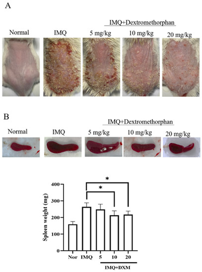 Clinical symptoms of psoriasis are regulated by various doses of DXM. (A) The macroscopic appearance and the psoriasis area with 5, 10 and 20 mg/kg DXM treatment by oral administration. (B) The spleen weight of IMQ-induced psoriasis-like mice after DXM treatment. Significant differences from IMQ treated group are indicated by * p < 0.05.