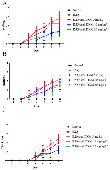 PASI score of the skin lesions in IMQ-induced murine psoriasis after treatment with 5, 10 and 20 mg/kg orally administered DXM. (A) Scaling, (B) Redness, and (C) Thickness. ** p < 0.01 (Two-way ANOVA) versus the IMQ group.