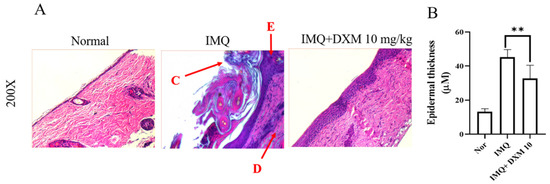 Histological examinations were performed to evaluate the effects of DXM on alleviating the symptoms of psoriasis and inhibiting keratinocyte proliferation in the IMQ-induced mouse model. As shown in Figure 5, the IMQ group had severe inflammation, abnormal alteration in epithelial structure with stratum corneum thickening (C), and increased acanthosis and hyperkeratosis of the epidermis (E) in the skin of mice compared to the control group. After treatment with 10 mg/kg DXM, the psoriasis symptoms of desquamation, immune cell infiltration, and stratum corneum thickening (Figure 5A,B) were significantly reduced.