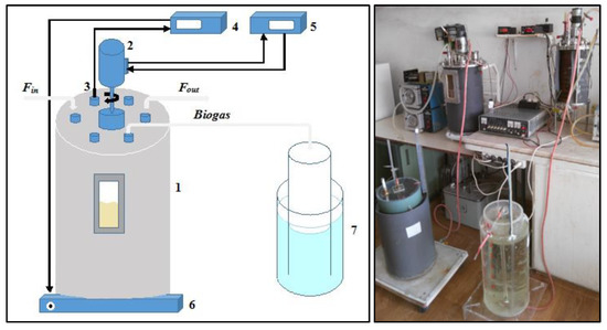 Bioreactor set-up diagram (left) and original experimental setup (right): 1. bioreactor; 2. DC-motor for stirrer; 3. Pt-100 temperature probe; 4. regulator and process indicator for temperature control; 5. regulator and process indicator for stirring speed; 6. heating device; 7. gas holder (water displacement principle).