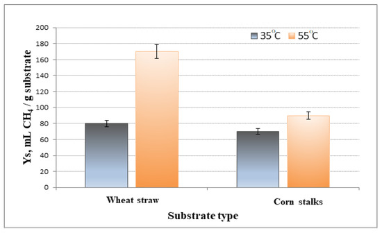 The yield coefficient was calculated. Ys is the amount of product obtained/the amount of introduced substrate. As presented in Figure 2, the increase in temperature during the anaerobic digestion process led to a significant increase in biomethane production when applying wheat straw as a substrate (52.8%) and a slight increase when using corn stalks as a substrate (21.9%). This may have been due to the higher lignin content in corn stalks (Table 1).