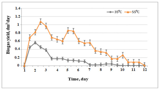 Two temperature regimes (35 °C and 55 °C) and two substrates were initially applied to estimate and compare the effect. For both substrates subjected to biodegradation at equal loading of 5 g/L, the volumes of biogas released were greater at 55 °C (Figure 2).