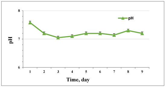 The pH during the process of biogas production was in the range of 7.58 to 7.2 (Figure 6). With the increase in VFA concentration (Figure 7) on day 2, the pH slightly dropped. This result suggests that changes in the distribution of fermentative products could cause variation in pH and influence the process itself. The acidification in the initial phase was relatively low, possibly due to the buffering capacity of the inoculum used.