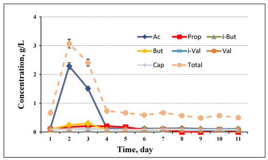Profile of VFA during the anaerobic digestion process at 30 g/L loading.