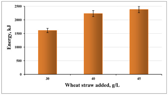 Decreasing the viscosity, and hence the need for energy for vigorous stirring, are other important issues [40]. Therefore, we turned our attention to how much energy we would obtain from the methane obtained from the biogas mixture. It is well known that methane production using wheat straw is one of the best applications of agricultural waste [41]. In addition, biogas/methane is produced using anaerobic degradation of lignocellulosic biomass, which has a higher energy efficiency compared with ethanol production from wheat straw [42]. In addition, wheat was selected as it is the main crop of many nations; residues from agricultural activities in the European Union exceed 200 million tons every year and mostly constitute cereal straw [43].