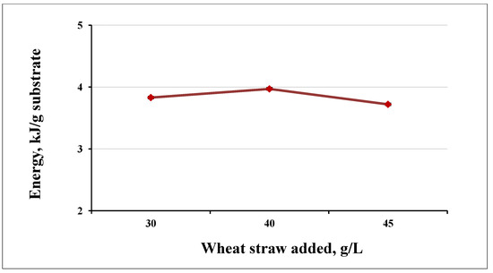 The highest energy yield was reached at a load of 40 g/L. We obtained less energy at 45 g/L per unit of substrate (Figure 8). The difference in the obtained energy between 40 g/L and 45 g/L load was smaller than between 30 g/L and 40 g/L (Figure 9).