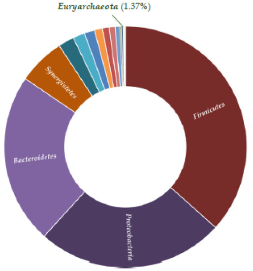 In our study, the metagenome investigation of the biodiversity in the thermophilic anaerobic digester showed that bacteria strongly prevailed over archaea, comprising 98.63% of the microbial content (Figure 11). The most abundant phyla were Firmicutes (38.39%), Proteobacteria (24.58%), Bacteroidetes (22.66%), Spirochaetes (3.92%), Synergistetes (2.72%), Chloroflexi (1.11%), Coprothermobacterota (0.89%), and Actinobacteria (0.71%).
