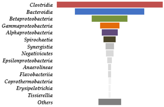 Among bacterial classes, the most abundant were Clostridia, Bacteroidia, Betaproteobacteria, Gammaproteobacteria, and Alphaproteobacteria, followed by Spirochaetia (Figure 12).