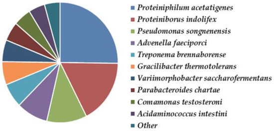 Utilizing a wide range of substrates and tolerating high concentrations of VFA and alcohols, Clostridia were the most abundant bacteria, followed by Bacteroidetes, which are largely involved in biomass degradation and are indispensable in the prevention of bioreactor acidosis [47]. The prevailing bacterial genera were Proteiniphilum (12.25%), Proteiniborus (8.40%), Pseudomonas (5.97%), Advenella (4.26%), Treponema (3.68%), Gracilibacter (3.03%), Parabacteroides (2.94%), Variimorphobacter (2.84%), Comamonas (2.72%), Anaerobacterium (1.81%), Ruminiclostridium (1.78%), Acetomicrobium (1.74%), and Thermoclostridium (1.65%). The corresponding species are shown in Figure 13.