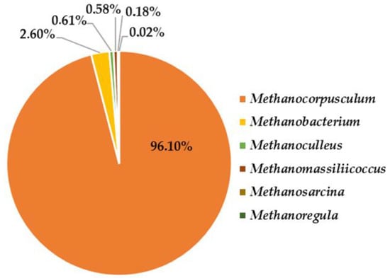 Archaeal share was 1.37% of the microflora in the thermophilic bioreactor, as representatives of the genera Methanocorpusculum, Methanobacterium, Methanoculleus, Methanosarcina, Methanomassiliicoccus, Methanosarcina, and Methanoregula were the most abundant (Figure 14). All are members of the thermophilic phylum Euryarchaeota.