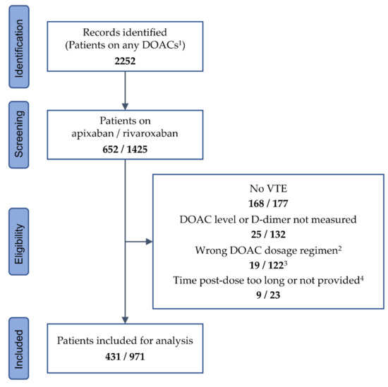 Identification and inclusion of patient data. 1 Including dabigatran (n = 92) and edoxaban (n = 83). 2 Any dosage regimen other than apixaban 5 or 2.5 mg twice daily, and rivaroxaban 20 or 10 mg once daily. 3 Thereof 43 patients taking rivaroxaban 15 mg once daily. 4 Time post-dose >18 h for apixaban, and >36 h for rivaroxaban. DOAC—direct oral anticoagulant; VTE—venous thromboembolism.