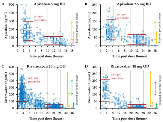 In total, 212 (29%) of all samples from patients on apixaban were obtained 3–4 h post-dose at the expected peak plasma concentration [9], and 173 (24%) samples were collected 10–14 h after the last intake of apixaban. Among the samples from patients on rivaroxaban, 556 (38%) and 416 (28%) were collected at the expected peak (2–4 h post-dose) and trough (20–28 h post-dose) plasma concentrations [10,11,12].