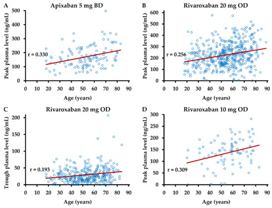 Dependence of drug levels on age. Anti-Xa activity was measured in plasma samples obtained (A) 3–4 h after intake of apixaban 5 mg (n = 72), (B) 2–4 h after intake of rivaroxaban 20 mg (n = 476), (C) 20–28 h after intake of rivaroxaban 20 mg (n = 312), and (D) 2–4 h after intake of rivaroxaban 10 mg (n = 80). Plasma concentrations were calculated using drug-specific calibrators. BD—bis in die, twice daily; OD—once daily; r—Pearson’s correlation coefficient.
