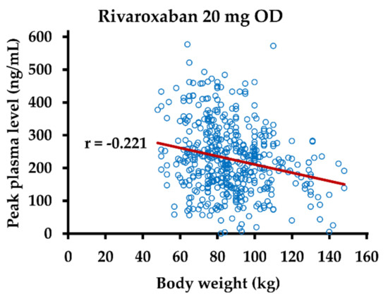 In samples from patients on rivaroxaban 20 mg OD, a weak negative correlation between body weight and drug level at the peak post-dose interval was observed (Figure 4).