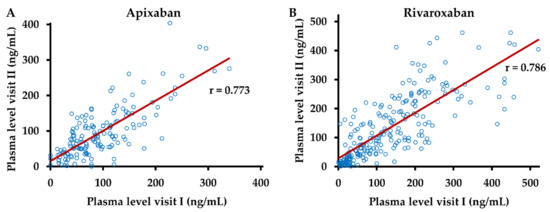 In order to assess the intra-individual variation of DOAC levels, we analyzed the correlation between plasma levels in samples, which had been obtained at two subsequent visits at identical dosages of apixaban and rivaroxaban and differences of four hours or less between the respective post-dose intervals (Figure 5).