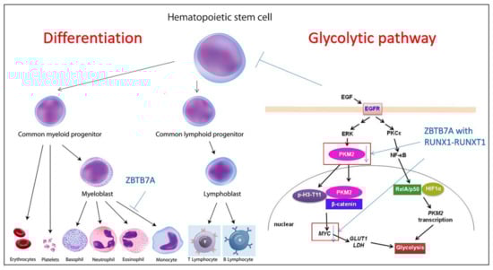 - Monte, E.R.; Wilding, A.; Leubolt, G.; Kerbs, P.; Bagnoli, J.W.; Hartmann, L.; Hiddemann, W.; Chen-Wichmann, L.; Krebs, S.; Blum, H.; et al. ZBTB7A prevents RUNX1-RUNX1T1-dependent clonal expansion of human hematopoietic stem and progenitor cells. Oncogene 2020, 39, 3195–3205. [Google Scholar] [CrossRef]