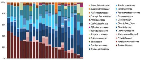 The diversity of the intestinal microbiota in healthy dogs [14,20]. Each column represents the composition of the microbiota in one healthy dog. Reprinted with permission from Suchodolski J [14].