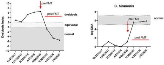A dog with persistent dysbiosis and recurrent C. difficile infection. After FMT, the dysbiosis index normalized and the abundance of C. hiranonis increased. The dog was subsequently negative for C. difficile [32] From article under the CC BY-NC-ND license, no changes were made.