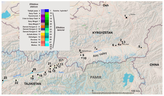 Map of localities studied for E. alaicus (triangles), E. tancrei (circles), and proposed hybrid zone (square) in Gulcha vicinities (Kyrgyzstan). Colors of the incorporated table correspond to the numbers of studied localities (see Table S1). Points 24–30 were beyond the map.