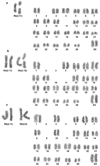 - Matveevsky, S.; Tretiakov, A.; Kashintsova, A.; Bakloushinskaya, I.; Kolomiets, O. Meiotic nuclear architecture in distinct mole vole hybrids with Robertsonian translocations: Chromosome chains, stretched centromeres, and distorted recombination. Int. J. Mol. Sci. 2020, 21, 7630. [Google Scholar] [CrossRef]