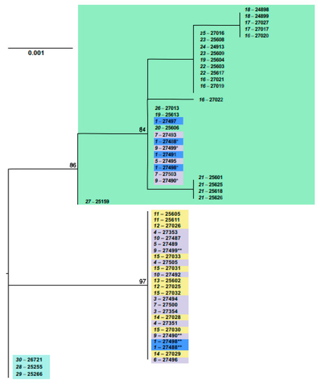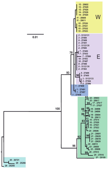 - Kumar, S.; Stecher, G.; Li, M.; Knyaz, C.; Tamura, K. MEGA X: Molecular Evolutionary Genetics Analysis across Computing Platforms. Mol. Biol. Evol. 2018, 35, 1547–1549. [Google Scholar] [CrossRef] [PubMed]