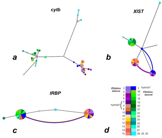 Haplowebs generated by HaplowebMaker for cytb (a), XIST (b), and IRBP (c) genes of studied mole voles (see Table S1). The circles represent alleles with sizes proportional to their frequency in the populations. The investigated taxonomic hypotheses are distinguished by different colors (d). The length of the branches is proportional to the number of mutations. The curves connect individuals sharing one unique pool of alleles. The thickness of the curves is proportional to the number of hybrids.
