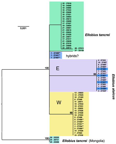 The maximum-likelihood tree as inferred from the IRBP gene data on 56 specimens of E. tancrei and E. alaicus. The dendrogram was rooted on the group of mole voles from Mongolia. Numbers above nodes correspond to bootstrap support (>70%). The names of the samples are presented in the form of “locality number—individual number”. Haplotypes, which were hypothetically deduced from heterozygous genotypes, are marked by asterisks: the haplotype typical for E. tancrei is marked by one asterisk, whilst the haplotype typical for the majority of E. alaicus specimens is marked by two asterisks. The color selection corresponds to haplowebs: cyan marks Mongolian E. tancrei (#28–30); green marks Central Asian E. tancrei specimens; blue marks probable interspecific hybrids from Gulcha vicinities (#1); purple and yellow mark E. alaicus specimens with “eastern” and “western” XIST haplotypes, respectively.