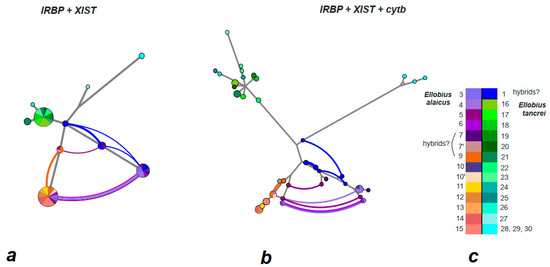 Haplowebs for two nuclear markers (a) and three markers, including cytb (b), of studied mole voles (see Table S1). The investigated taxonomic hypotheses are distinguished by different colors (c). The circles represent alleles with sizes proportional to their frequency in the populations. The length of the branches is proportional to the number of mutations. The curves connect individuals sharing one unique pool of alleles. The thickness of the curves is proportional to the number of hybrids.