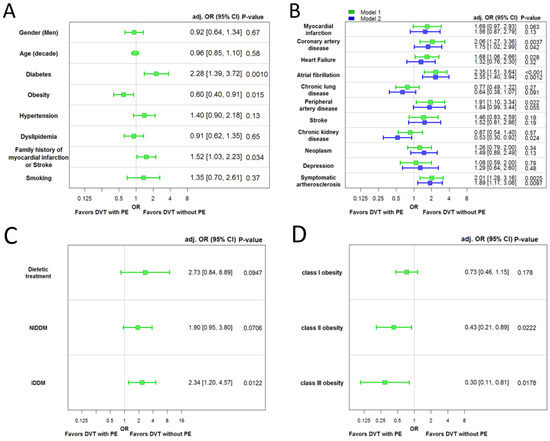 Associations of classical cardiovascular risk factors and comorbidities with DVT with or without PE. (A) Cardiovascular risk factors as independent predictors for a history of PE in multivariable logistic regression models in patients with DVT: the model contained the following variables: sex, age, diabetes, obesity, hypertension, dyslipidemia, family history of myocardial infarction or stroke and smoking. (B) Multivariable logistic regression models were used to evaluate the association with concomitant history of PE (i.e., the dependent variable; reference: no history of PE). In model 1, each concomitant disease was adjusted for cardiovascular risk factors (i.e., the independent variables) in a separate model, and in model 2, all concomitant diseases (MI was not taken for adjustment due to the co-linearity with CAD and PAD; CAD and MI were not taken for adjustment due to the co-linearity with symptomatic atherosclerosis) and CVRF were included in one model. Symptomatic atherosclerosis was defined as the presence of CAD, MI and/or PAD. (C) Multivariable logistic regression models were used to evaluate the association between DVT with concomitant PE (i.e., the dependent variable; reference: no history of PE) and the escalation of anti-diabetic treatment under adjustment for cardiovascular risk factors (i.e., the independent variables). (D) Multivariable logistic regression models were used to evaluate the association between a DVT with PE (i.e., the dependent variable; reference: no history of PE) and the sub-classes of obesity while adjusting for cardiovascular risk factors (i.e., the independent variables) in DVT patients. The obesity sub-classes were defined according to the World health Organization (WHO, 2008), which defined obesity class I as BMI a between 30.0 and 34.9 kg/m2, class II as a BMI between 35.0–39.9 kg/m2 and class III as a BMI ≥ 40.0 kg/m2. Abbreviations: BMI = body mass index; DVT = deep venous thrombosis; PE = pulmonary embolism; NIDDM = non-insulin-dependent diabetes mellitus; IDDM = insulin-dependent diabetes mellitus. p-values < 0.05 were considered as significant associations.
