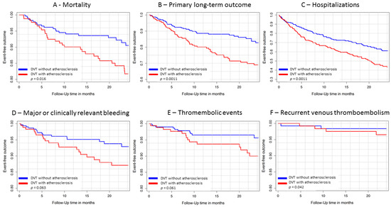 Comparison of DVT patients with and without additional symptomatic atherosclerosis regardless of the presence of additional PE during a 2-year follow-up period under VKA treatment. (A) Kaplan–Meier-curve for mortality of DVT patients with and without symptomatic atherosclerosis. (B) Kaplan–Meier-curve for primary long-term outcome of DVT patients with and without symptomatic atherosclerosis. (C) Kaplan–Meier-curve for hospitalizations of DVT patients with and without symptomatic atherosclerosis. (D) Kaplan–Meier-curve for major or clinically relevant bleeding of DVT patients with and without symptomatic atherosclerosis. (E) Kaplan–Meier-curve for thromboembolic arterial and venous events of DVT patients with and without symptomatic atherosclerosis. (F) Kaplan–Meier-curve for recurrent VTE of DVT patients with and without symptomatic atherosclerosis. Abbreviations: DVT = deep venous thrombosis; PE = pulmonary embolism. Differences in Kaplan–Meier curves were tested with the log-rank test. p-values < 0.05 were considered as significant associations.