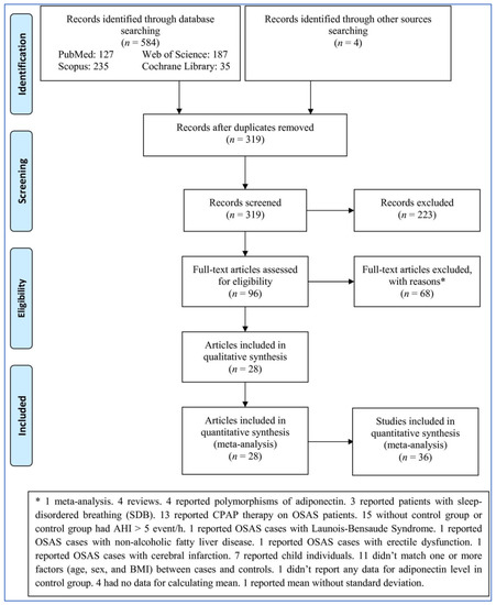 The search in four databases and by hand in other sources identified 588 records (Figure 1). After removing duplicates and irrelevant records, 96 full-text articles were assessed based on the criteria above: 68 articles were excluded for various reasons (1 was a meta-analysis, 4 were reviews, 4 reported polymorphisms of adiponectin, 3 reported patients with sleep-disordered breathing (SDB), 13 reported CPAP therapy on OSAS patients, 15 lacked a control group or the control group had AHI > 5 event/h, 1 reported OSAS cases with Launois–Bensaude Syndrome, 1 reported OSAS cases with non-alcoholic fatty liver disease, 1 reported OSAS cases with erectile dysfunction, 1 reported OSAS cases with cerebral infarction, 7 reported child individuals, 11 did not match one or more factors (age, sex, and BMI) between cases and controls, 1 did not report any data for adiponectin level in the control group, 4 had no data for calculating the mean, and 1 reported mean without a standard deviation). Finally, 28 articles including 36 studies were entered into the meta-analysis.