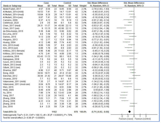 Al Mutairi, 2014 (mild) [35]514210.53 ± 7.4114.70 ± 13.0149.1 ± 17.055.8 ± 16.343.3 ± 10.540.5 ± 11.910.3 ± 3.82.6 ± 1.6