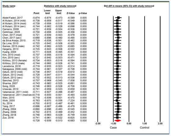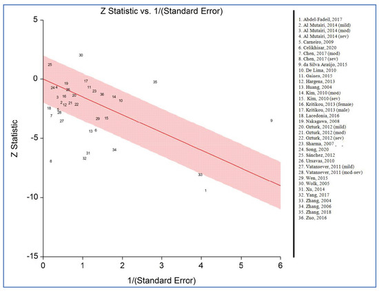 Figure 6 illustrates the Galbraith (Radial) plot of plasma/serum adiponectin levels for individuals with OSAS versus controls. The plot detected 16 potential outliers that were removed and after that, the pooled SMD became −0.34 with lack of heterogeneity (95% CI: −0.47, −0.22; p < 0.00001; I2 = 4%). Therefore, these outliers can be one of the sources of heterogeneity in the initial analysis.