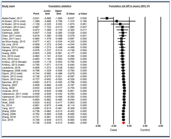 Regarding the plasma/serum levels of adiponectin in individuals with OSAS compared to controls, the results have been mixed [34,35,36,37], with some studies reporting no differences of plasma/serum levels of adiponectin between individuals with and without OSAS, and some reporting lower plasma/serum levels of adiponectin in individuals with OSAS, compared to those without OSAS. Similarly, a meta-analysis [38] including data until January 2018 and based on 20 articles reported that the plasma/serum levels of adiponectin in individuals with OSAS were significantly lower than age-, sex-, and BMI-matched controls. We report a more recent meta-analysis to find a more conclusive answer to whether plasma/serum levels of adiponectin differed between individuals with and without OSAS, using a systematic review and meta-analysis based on 28 articles including trial sequential analysis (TSA) and radial and L’Abbé plots in individuals with OSAS, compared with age-, sex-, and BMI-matched controls, which had not been meta-analytically analyzed [38] so far.