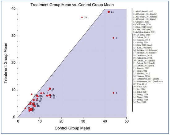 Figure 7 shows the L’Abbé plot of the plasma/serum adiponectin levels for individuals with OSAS versus the controls. The plot displays evidence of heterogeneity (Q statistic, 229.90; p < 0.001). Therefore, a significant relationship between the mean levels of adiponectin in individuals with and without OSAS appears to be unlikely.