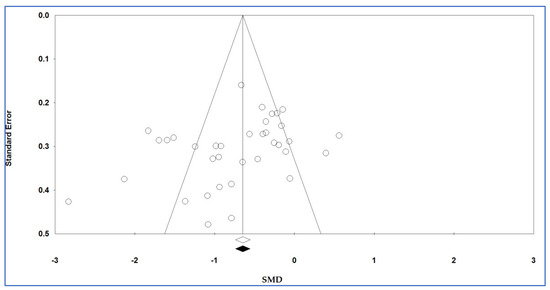 Table 5 illustrates the results of the trim-and-fill method on bias. For the plasma/serum levels of adiponectin and 0 imputed studies, under the fixed-effects model, the point estimate and pseudo 95% CI for the combined studies was −0.647 (−0.740, −0.553); using the trim-fill method, the imputed point estimate was −0.647 (−0.740, −0.553). In addition, under the random-effects model, the point estimate and 95% CI for the combined studies was −0.726 (−0.939, −0.513); using the trim-fill method, the imputed point estimate was −0.726 (−0.939, −0.513). Therefore, the overall effect sizes on the plasma/serum levels of adiponectin reported in the forest plot appeared valid, with a trivial publication bias effect based on fixed-effects and random-effects models, because the observed estimates were similar to the adjusted estimates.