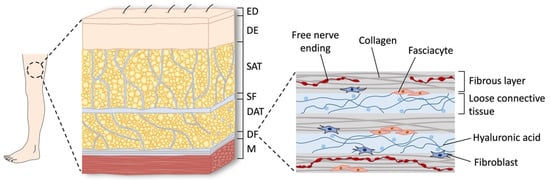 Anatomy of the human fascial system. The figure depicts the pattern of organization of the subcutaneous tissue and the superficial and deep fasciae. At a microscopic level, the DF consists of a multilayered structure of 2–3 fibrous layers of collagen fiber bundles separated by thin layers of loose connective tissue rich in hyaluronic acid (HA). The DF is also enriched in cellular components, namely fibroblasts and fasciacytes. Free nerve endings (FNEs) with several axonal widenings (i.e., varicosities) are also reported. ED = epidermis; DE = dermis; SAT = superficial adipose tissue; SF = superficial fascia; DAT = deep adipose tissue; DF = deep fascia; M = muscle.